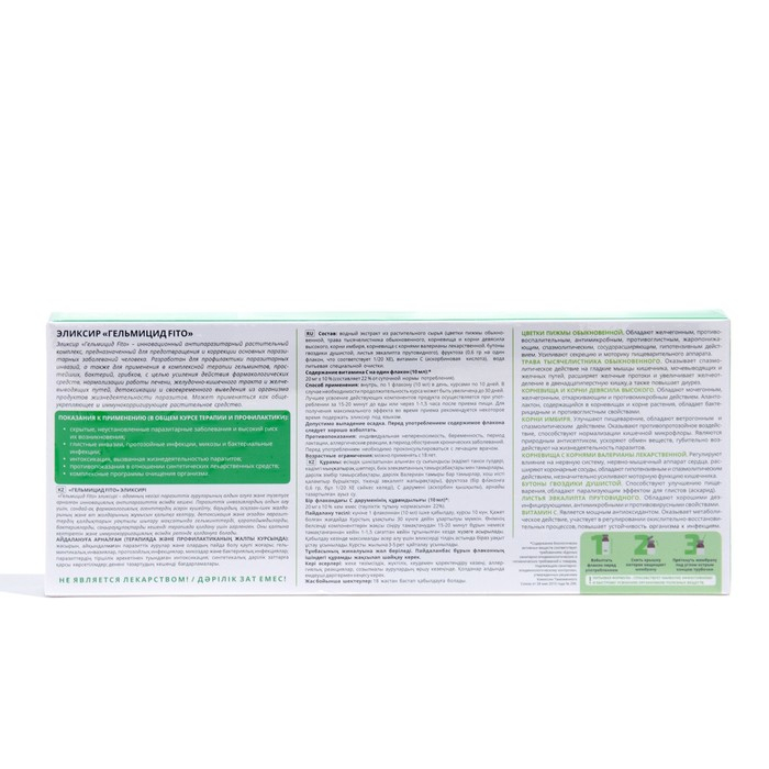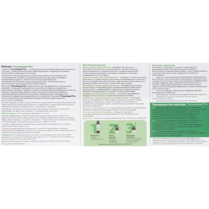 Эликсир Гельмицид Fito – инновационный антипаразитарный растительный комплекс, предназначенный для предотвращения и коррекции основных паразитарных заболеваний человека. Разработан для профилактики паразитарных инвазий, а также для применения в комплексной терапии гельминтов, простейших, бактерий, грибков, с целью усиления действия фармакологических средств, нормализации работы печени, желудочно-кишечного тракта и желчевыводящих путей, детоксикации и своевременного выведения из организма продуктов жизнедеятельности паразитов.