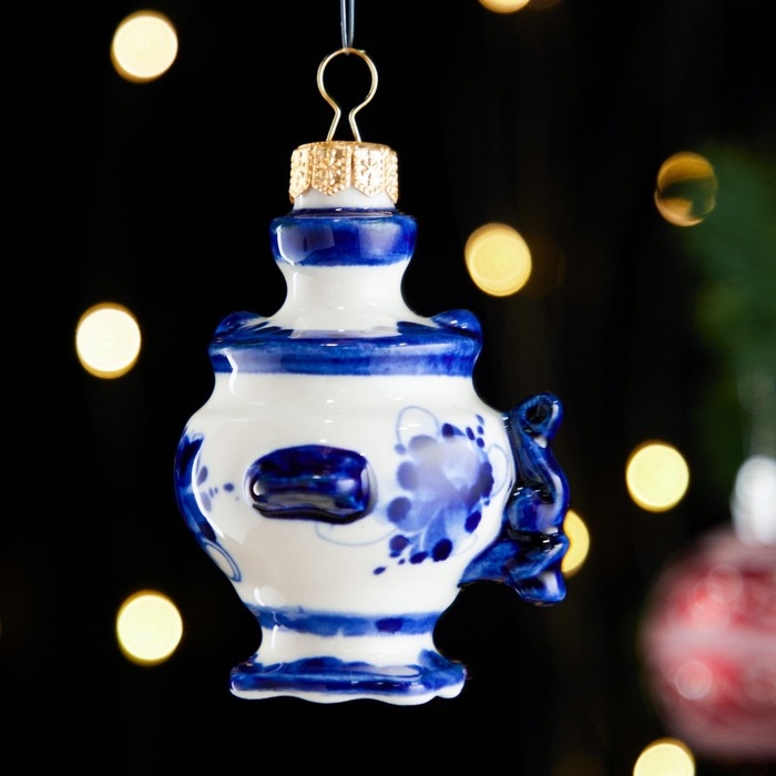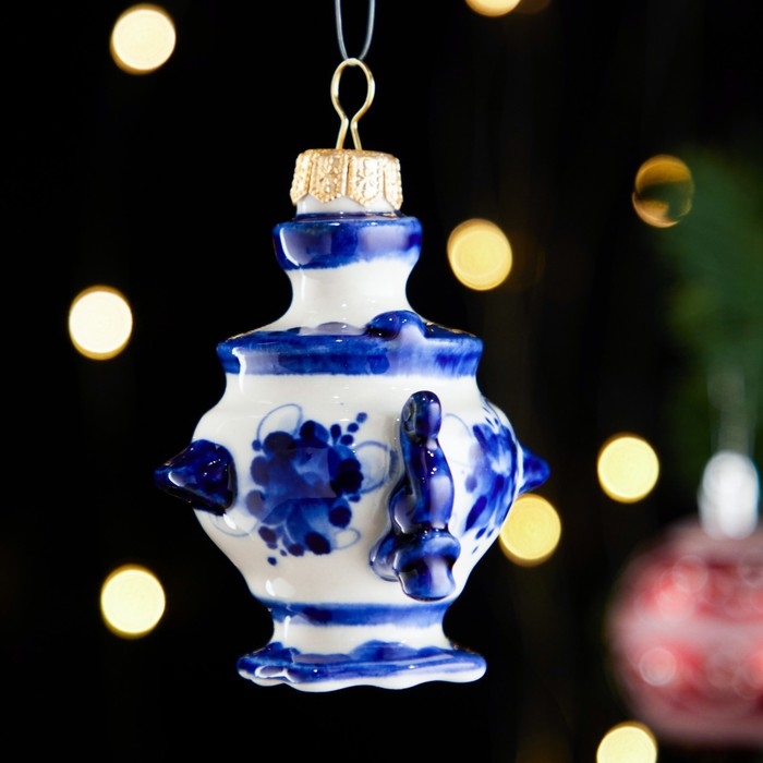 Ёлочная игрушка "Самовар", гжель, фарфор, h=9см