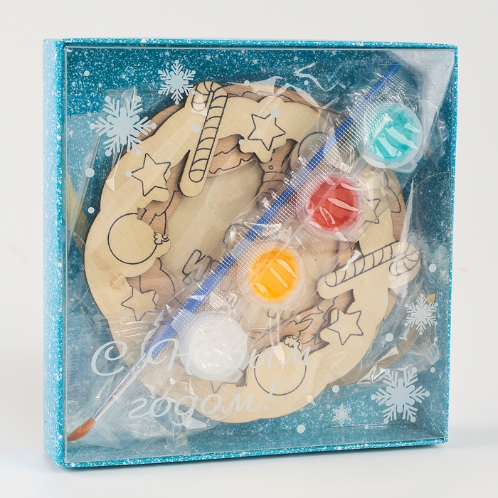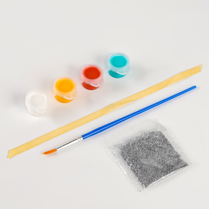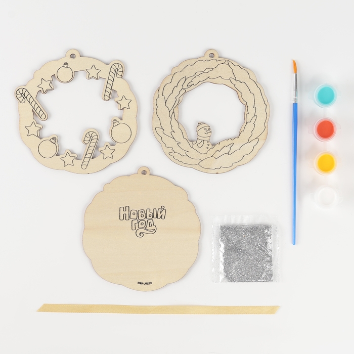 - В комплект входят деревянные заготовки, краски и кисточка, блёстки и лента.