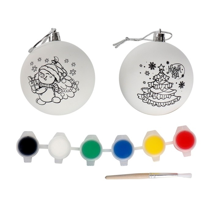 Ёлочные шары под раскраску на новый год «Исполнения желаний», d=7 см, 2 шт, краски, новогодний набор для творчества
