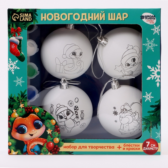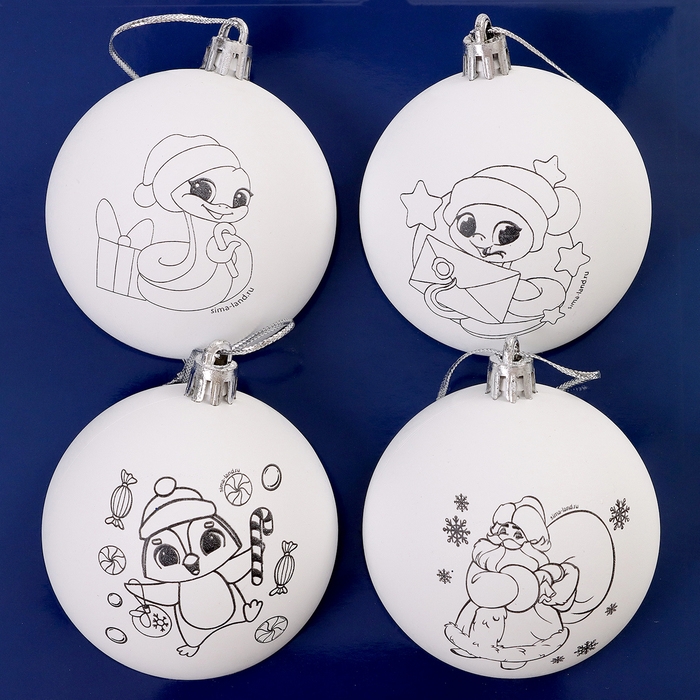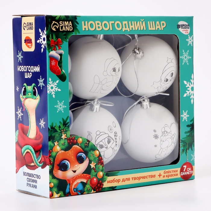 Ёлочные шары под раскраску на новый год «Новогодняя сказка. Змея», d = 7 см, 4 шт, новогодний набор для творчества