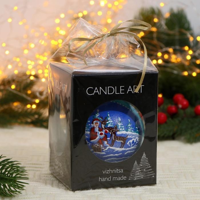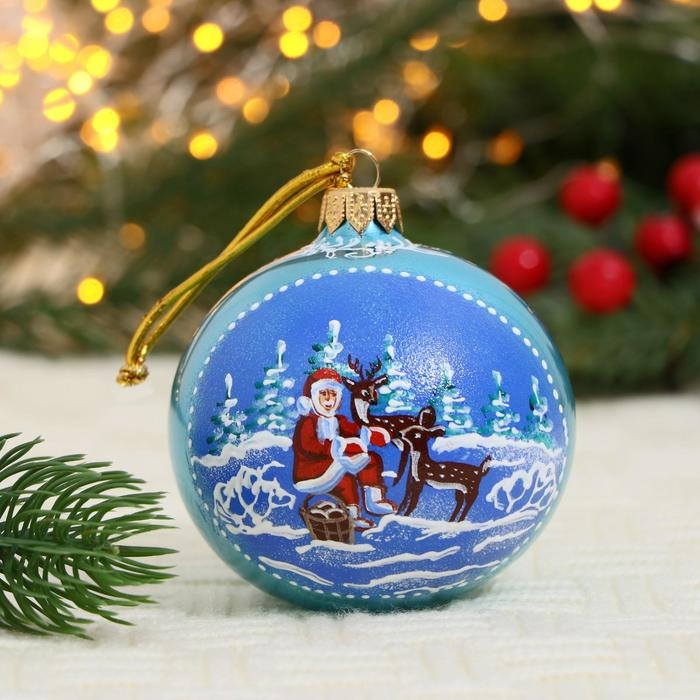 Ёлочный шар d-8 см "Дед Мороз в лесу" ручная роспись, голубой