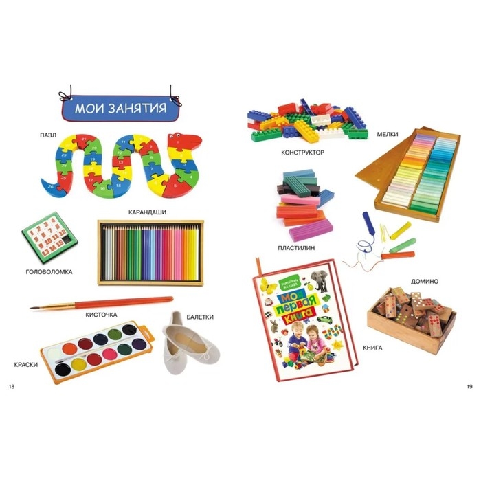 "Моя первая книга" составлена с учетом возрастных особенностей восприятия и мышления ребенка до 3 лет.Крупные яркие иллюстрации, понятные поясняющие надписи, логичная группировка картинок по темам сделают знакомство малыша с окружающим миром простым и увлекательным. Рассматривая и читая эту книгу вместе с ребенком, вы поможете ему развить внимание и воображение, пополнить словарный запас, стимулируете его умственное развитие. Малыш запомнит, как выглядят и как называются разные растения и животные, игрушки и машины, изучит цвета, формы и противоположности, откроет удивительный и разнообразный мир, который его окружает.Эта энциклопедия - незаменимое пособие для раннего развития малыша, которое станет его самой любимой книгой.