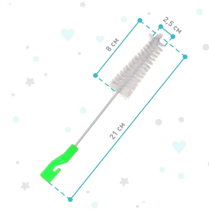 Данная модель легко и быстро устранит загрязнения. Щетина изготовлена из прочного и долговечного материала — нейлона. Покрутите ручку, чтобы смыть налёт со дна и выступов, и удалите остатки пищи, совершая вертикальные движения. На конце ручки находится маленький ёршик для мытья сосок.