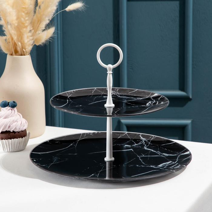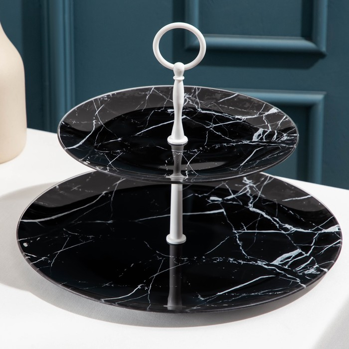 Этажерка-фруктовница стеклянная Доляна «Мрамор», d=21 см, d=30 см, 2 яруса, цвет чёрный