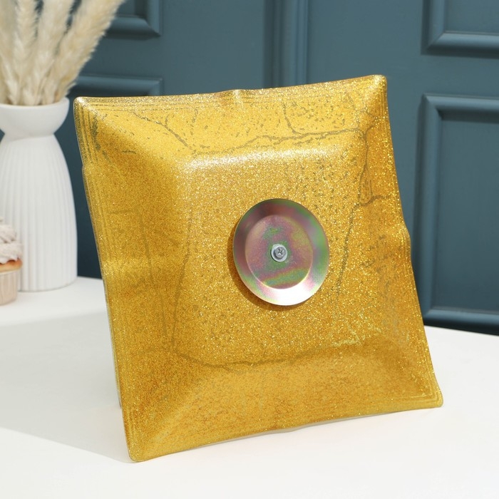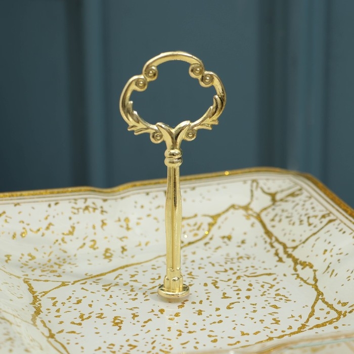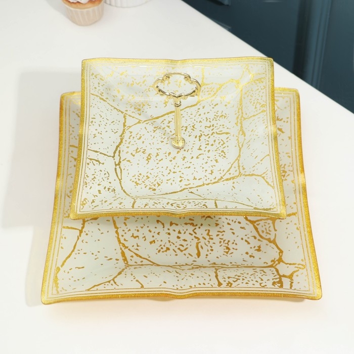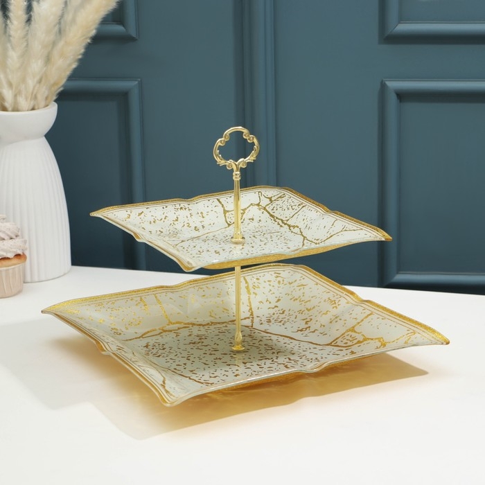 Оно выполнено из прочного стекла высокого качества и имеет квадратную форму, украшенную золотисто-бежевыми оттенками с необычным узором. Уникальный дизайн в виде двухъярусной конструкции позволяет разместить несколько различных блюд в одном.