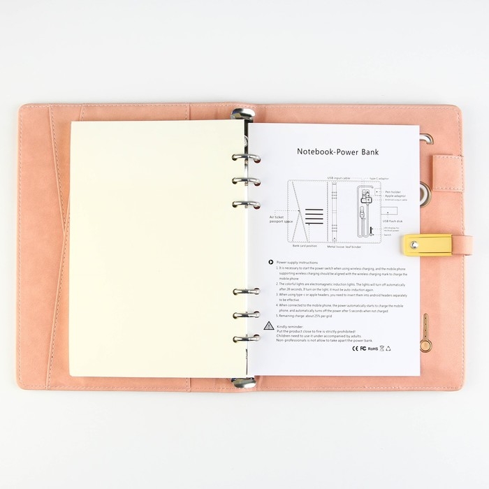 Набор состоит из блока листов для записей в количестве 80 листов: их вы со временем можете заменить на новый блок. Также в этом ежедневнике предусмотрен внешний аккумулятор на 8000 mAh, изящно скрытый на задней обложке. Зарядное устройство дополнено переходником, проводами с разъемами USB, micro-USB, Type-C и Lightning и кнопкой включения-выключения, расположенной рядом. Кроме этого внутри на обложке есть место под карандаш, кармашки для банковских карт и билетов.