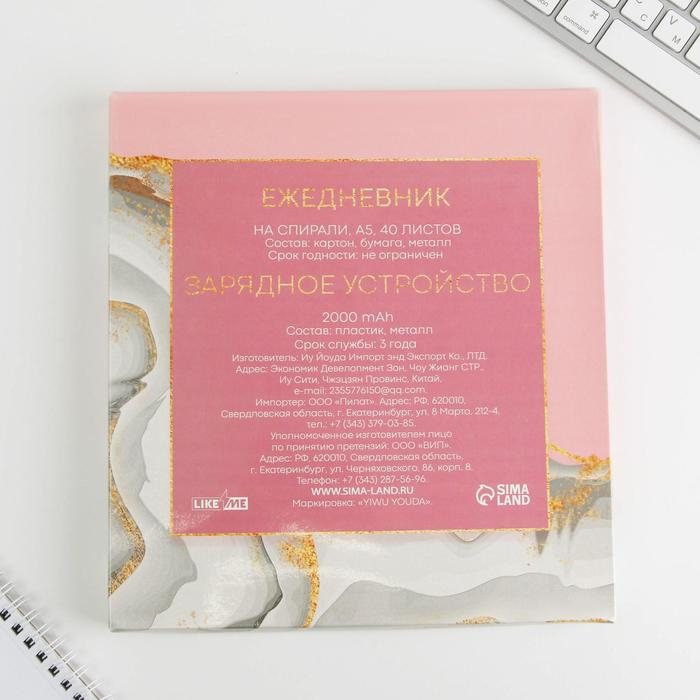 В набор входит ежедневник на спирали формата А5 (40 листов) и зарядное устройство 2000 mAh. В комплекте к внешнему аккумулятору идёт отдельный шнур для разъема USB и micro USB. Подходит для пополнения заряда аккумулятора мобильных телефонов, планшетов, MP3-плееров, цифровых фотокамер и других устройств.