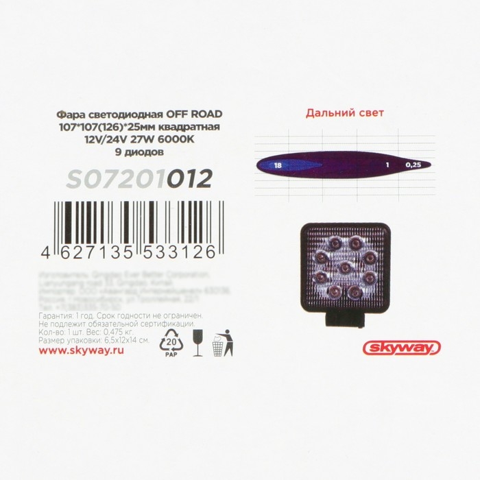 Фара светодиодная Skyway OFF ROAD, квадратная, 12/24 В, 27 Вт, 9 диодов, 107 х 107 мм, дальний свет