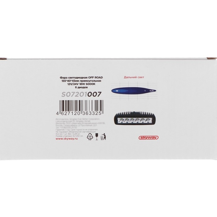 Фара светодиодная OFF ROAD 152x40мм прямоугольная 12V/24V 18W 6000K SKYWAY 6 диодов Дальний свет - светодиодная фара категории OFF ROAD: безопасный и надежный вариант в прочном корпусе и противоударным стеклом. Фары выдерживают сильные вибрации и тряску. Обеспечивают ровное освещение дороги. Светодиод отличается долгим сроком службы и высоким качеством.