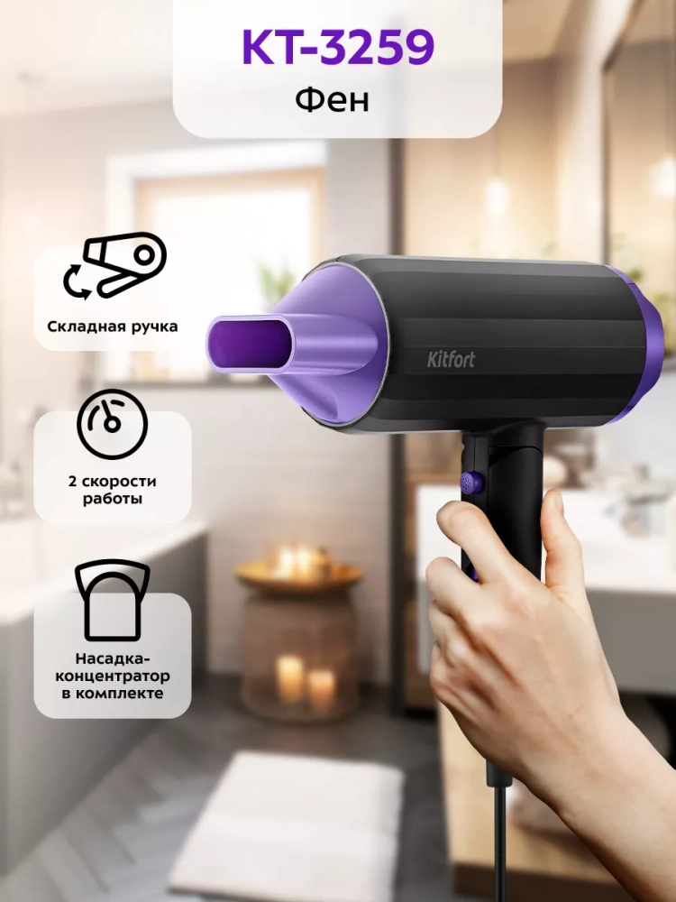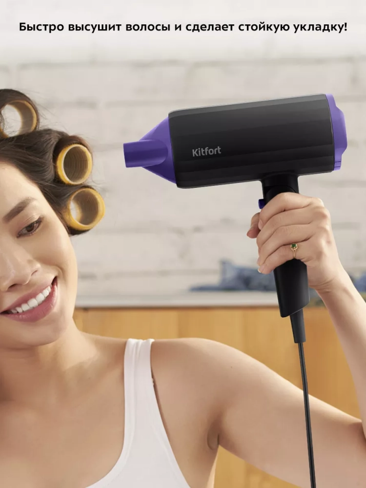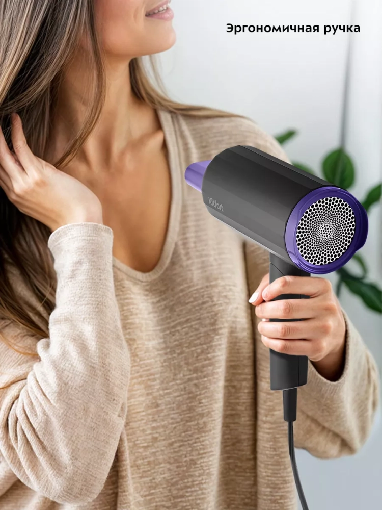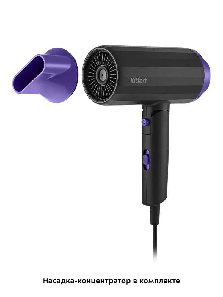 С помощью фена Kitfort КТ-3259 вы сможете быстро высушить волосы и сделать красивую укладку. Фен выдает направленный поток воздуха, поэтому волосы с ним сушить просто и удобно.