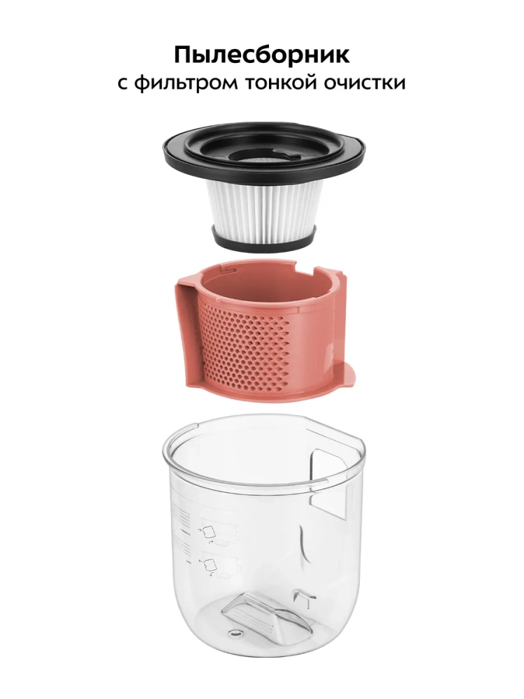 В пылесборнике емкостью 0,5 л установлены фильтр тонкой очистки и поролоновый фильтр, которые задерживают частички пыли от попадания в мотор устройства и обратно в воздух. Фильтры можно вынуть и промыть водой.