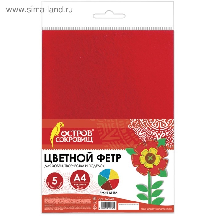 Цветной фетр ОСТРОВ СОКРОВИЩ предназначен для создания ярких творческих поделок дома, в школе и в детском саду. Используется для создания аппликаций и вышивания, легко режется и приклеивается на ровную поверхность. Плотность - 170 г/м2 и толщина в 2 мм гарантируют поделкам отличное качество и долгий срок службы. Цветной фетр формата А4 поставляется в упаковке по 5 листов, 5 ярких цветов. Такое многообразие оттенков придется по вкусу любому покупателю. Фетр Остров Сокровищ обладает приятной нежной фактурой, прост и удобен в использовании. Края не осыпаются при разрезании, благодаря чему не нуждаются в дополнительной обработке.Данный товар относится к среднему ценовому сегменту.