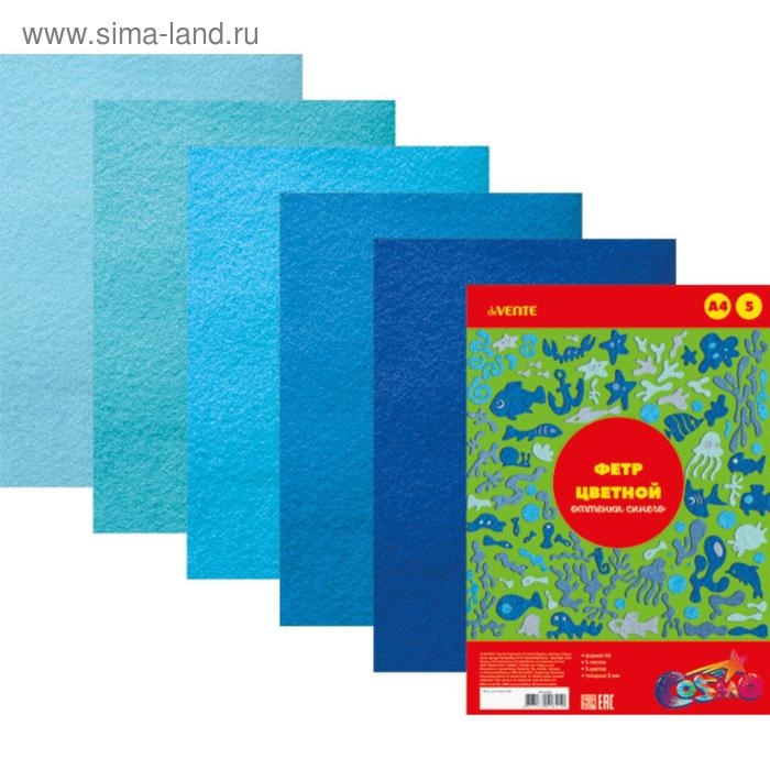 Фетр цветной мягкий A4 "deVENTE. Оттенки синего" 5 цветов, 5 листов, толщина 2 мм, пластиковый пакет с европодвесом