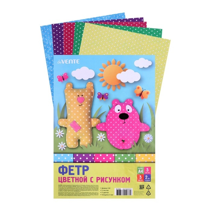 Фетр цветной мягкий с рисунком A4 "deVENTE. Горошек" 5 цветов, 5 листов, толщина 2 мм, пластиковый пакет с европодвесом