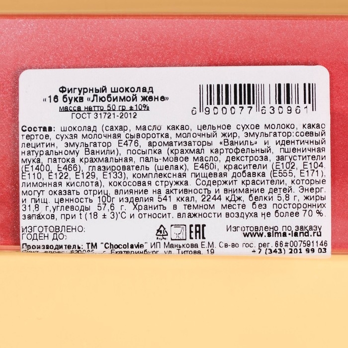 Фигурный шоколад "16 букв. Любимой жене", 50 г