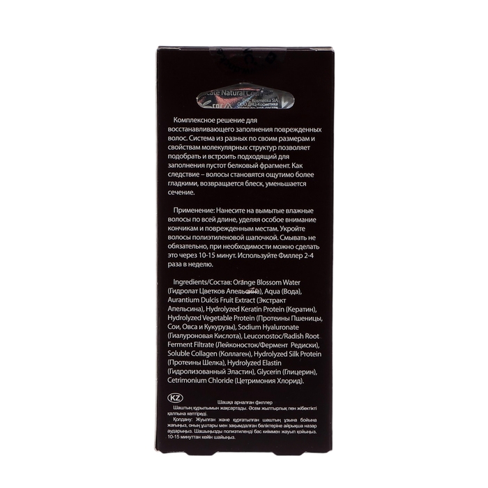 Состав: Orange Blossom Water (Гидролат Цветков Апельсина), Aqua (Вода), Aurantium Dulcis Fruit Extract (Экстракт Апельсина), Hydrolyzed Keratin Protein (Кератин), Hydrolyzed Vegetable Protein (Протеины Пшеницы, Сои, Овса и Кукурузы), Sodium Hyaluronate (Гиалуроновая Кислота), Leuconostoc/Radish Root Ferment Filtrate (Лейконосток/Фермент Редиски), Soluble Collagen (Коллаген), Hydrolyzed Silk Protein (Протеины Шелка), Hydrolyzed Elastin (Гидролизованный Эластин), Glycerin (Глицерин), Cetrimonium Chloride (Цетримония Хлорид).