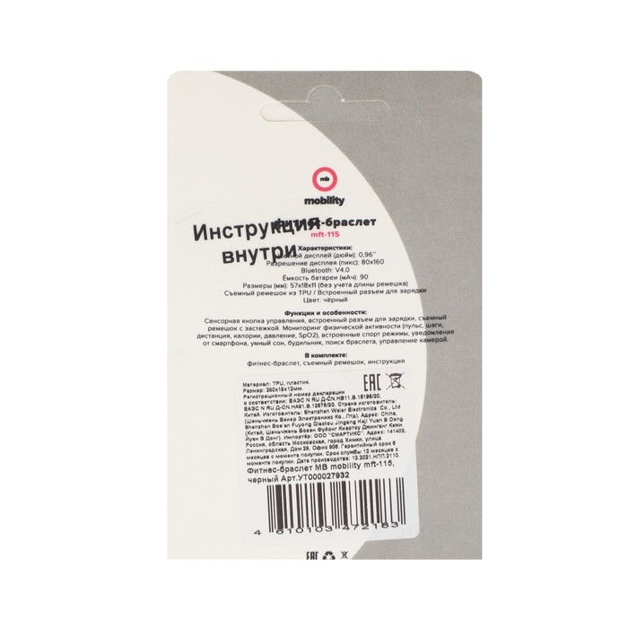 Фитнес-трекер Mobility mft-115 пригодится людям, следящим за своим здоровьем и ведущим активный образ жизни. Устройство поможет контролировать сердечный ритм, следить за качеством сна, фиксировать количество сделанных за день шагов и пройдённое расстояние, сообщит, сколько сожжено калорий.