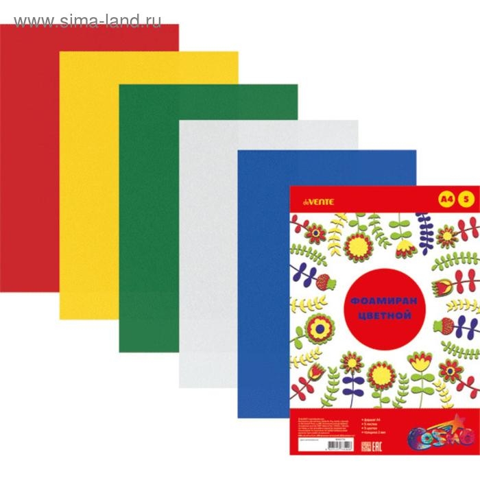 Фоамиран цветной A4 "deVENTE" 5 цв, 5 л, толщина 2 мм, пластиковый пакет с европодвесом.