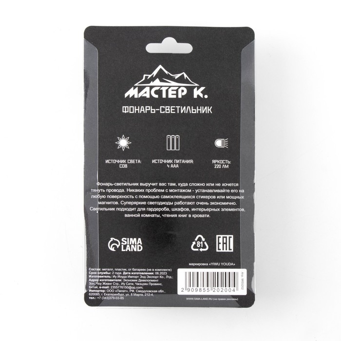 Фонарь-светильник "Мастер К", 220 лм, COB, 4 ААА, магнит, клейкая основа, 11.2 х 7.5 х 3 см