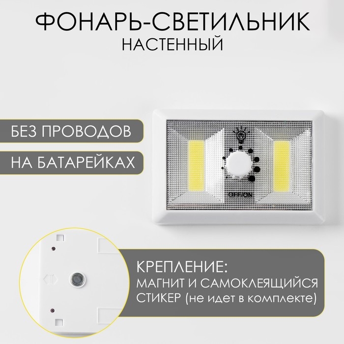 Фонарь-светильник, 3 Вт, 160 лм, COB, 3 ААА, клейкая основа, 4.4 х 2.8 х 13.8 см