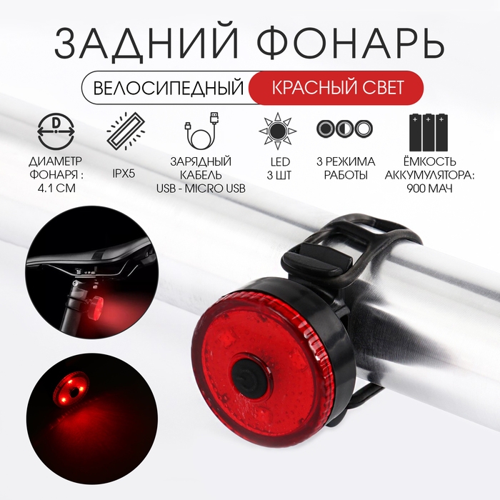 Фонарь велосипедный задний аккумуляторный, водонепроницаемый, 3 диода, 3 режима
