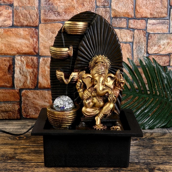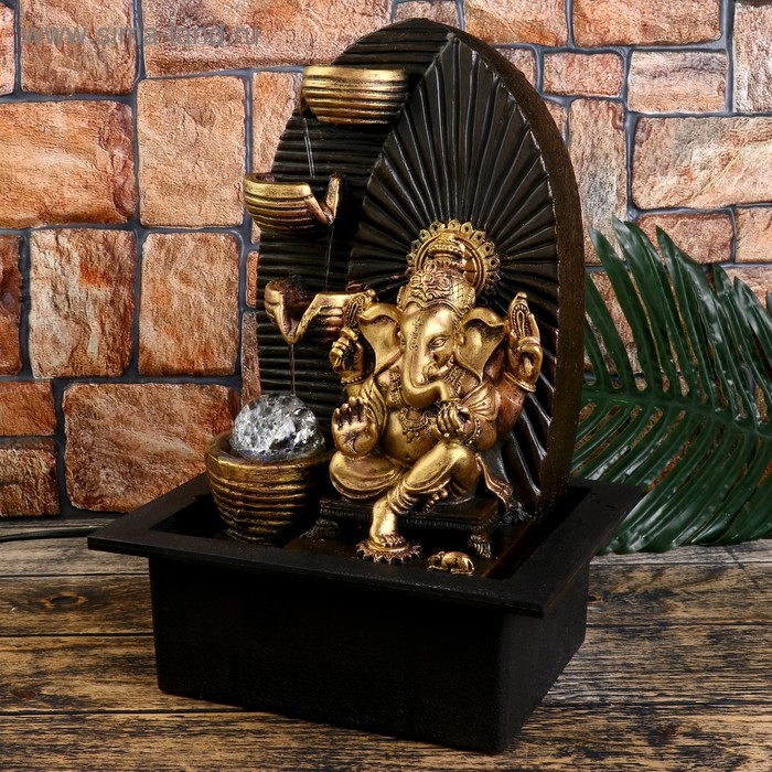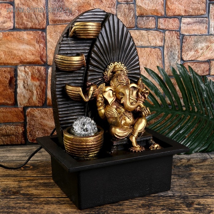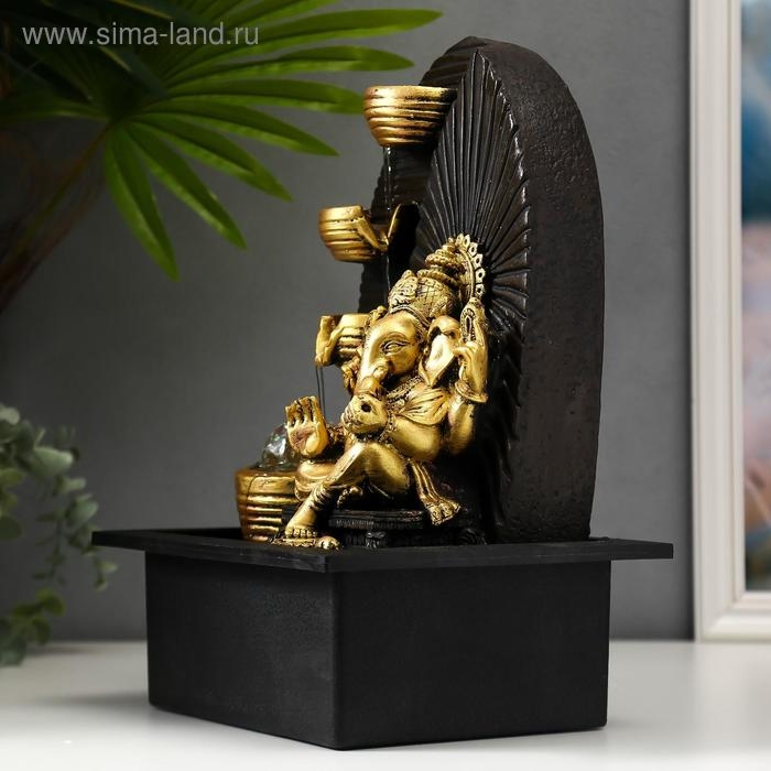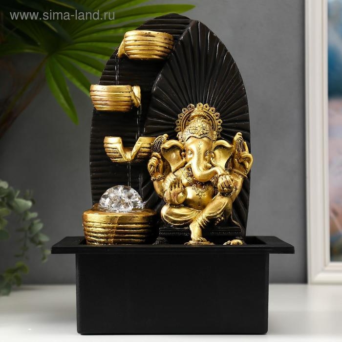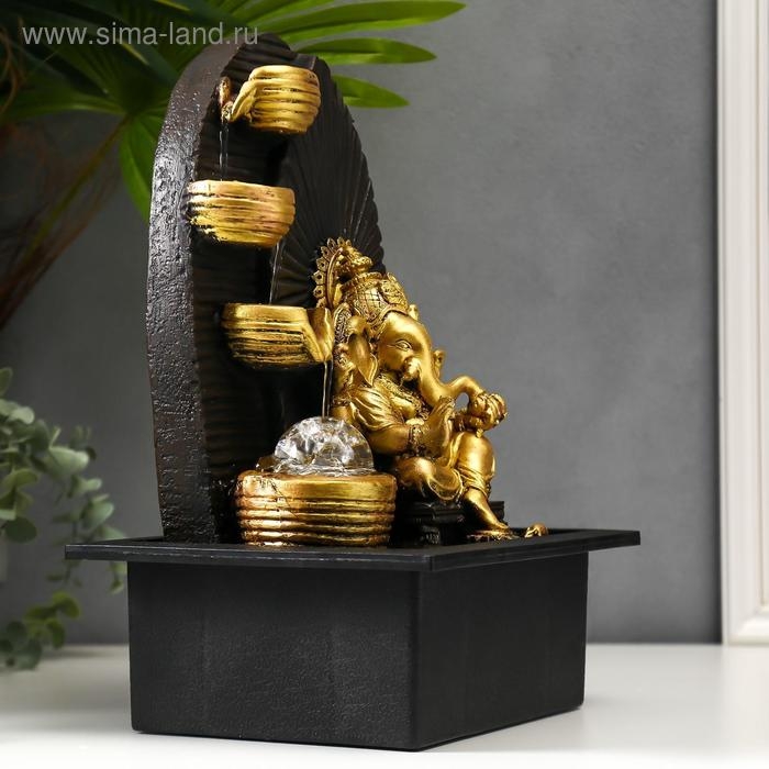 Фонтан настольный от сети, подсветка "Золотой Ганеша у водопада с чашами" 35х25х20 см