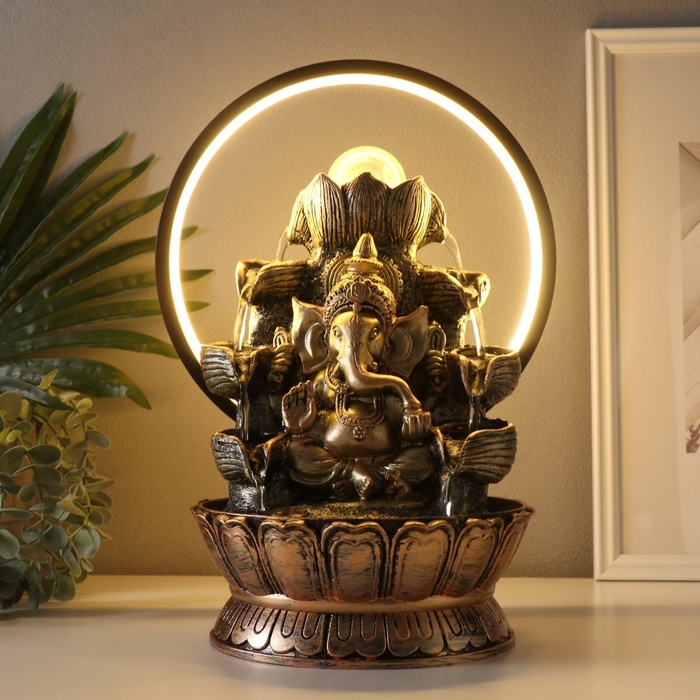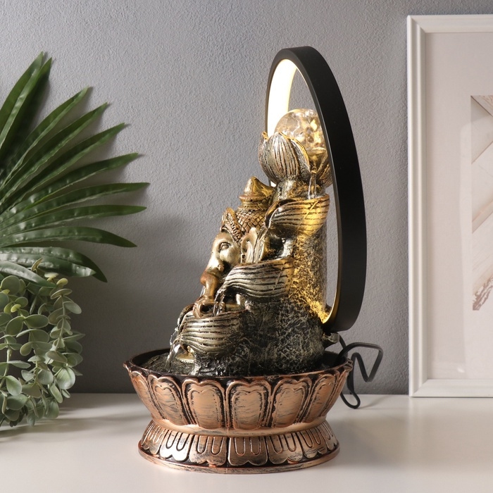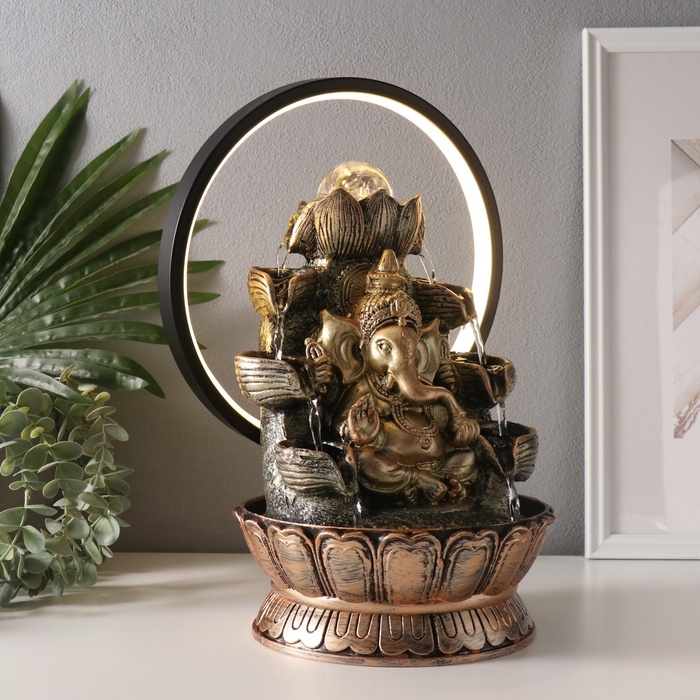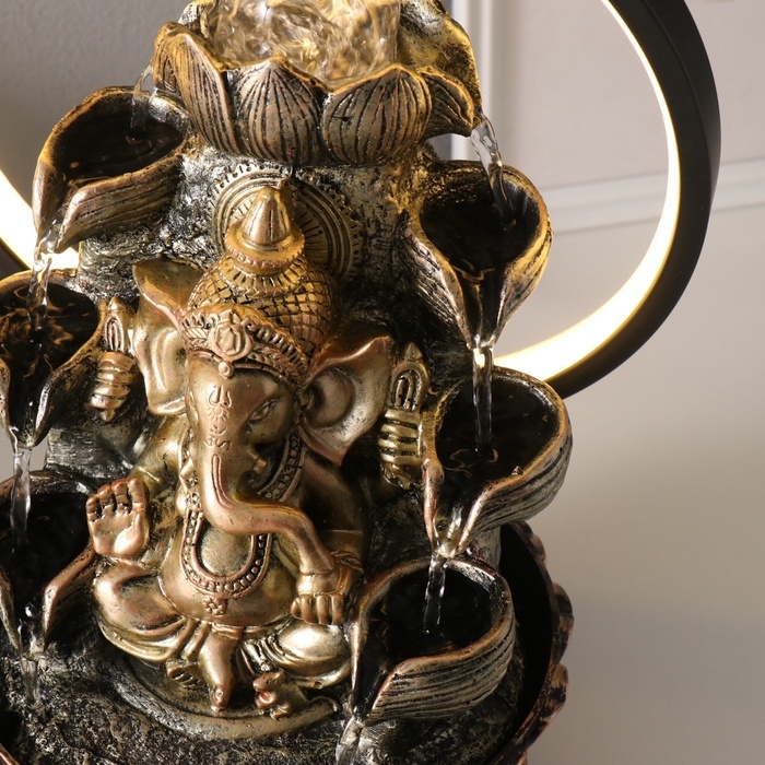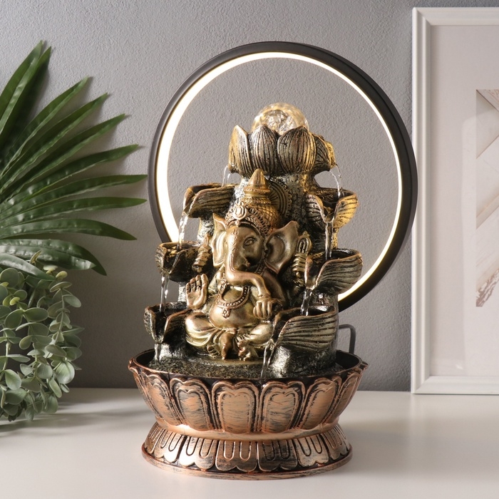 Фонтан настольный полистоун от сети, подсветка "Ганеша в золотом под водопадами" 25х20х34 см 10692