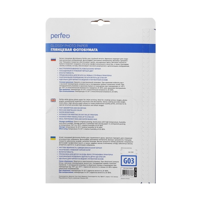 Изделие Perfeo PF-GLA4-190/50 обладает плотностью 190 г/м2, достаточной для домашней печати. Белые листы способствуют качественной печати любых изображений, а глянцевая поверхность обеспечивает получение ярких и контрастных красок, устойчивых к быстрому выгоранию на солнце. Печать осуществляется при разрешении 5760 dpi.