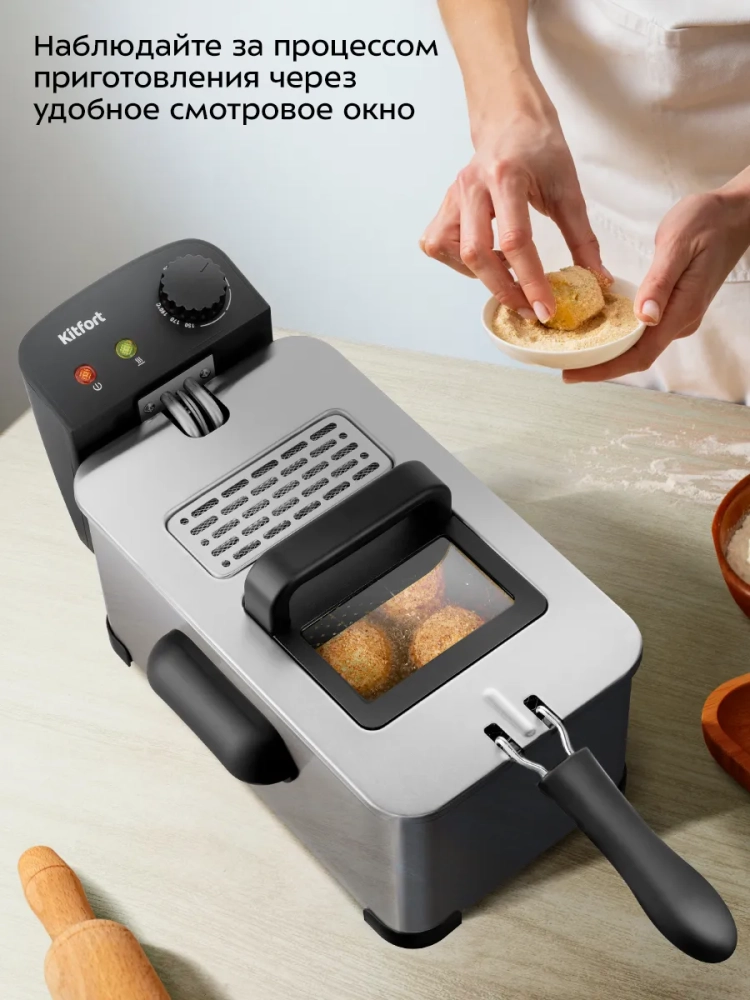 Ручки с обеих сторон корпуса позволяют удобно переносить фритюрницу. Для устойчивости прибор оснащен нескользящими силиконовыми ножками. В крышке фритюрницы имеется смотровое окно, через которое вы сможете следить за готовностью блюда, не поднимая крышку.