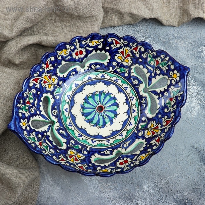 Фруктовница Риштанская Керамика "Цветы", 27 см, синее, рифлёное, овальное