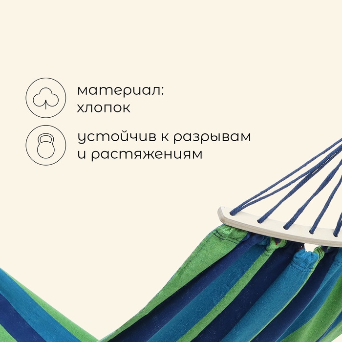 Гамак подходит для отдыха на свежем воздухе и в доме. Отличительная особенность модели — 2 деревянные перекладины, которые предотвращают скручивание гамака и делают его комфортным при использовании.