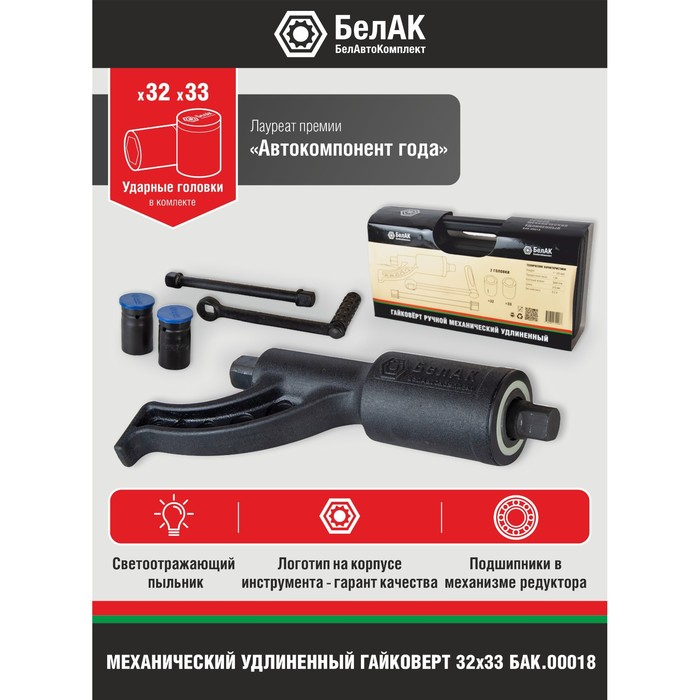 Гайковерт механический ручной удлиненный с набором головок (32 мм, 33 мм) "БелАК" БАК.00018 разработан российским производителем «БелАК», награждённым девятью национальными премиями «Автокомпонент года» и «Автоаксессуар года». Отдельная премия «Автокомпонент года» присуждена в номинации «Механические гайковерты» за высокое качество и надежность выпускаемых гайковертов. Продукция «БелАК» соответствуют нормам сертификации ISO9001 и ЕАС.