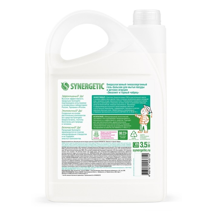 Гель-бальзам для мытья посуды и детских игрушек Synergetic "Эвкалипт и горный чабрец",биоразлагаемый, 3,5л