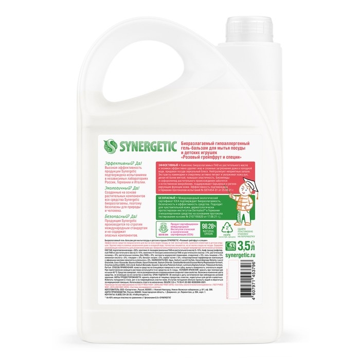 Гель-бальзам для мытья посуды и детских игрушекSynergetic"Розовый грейпфрут и специи",биоразлагаемый,3,5 л