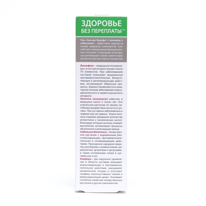 Состав: водные экстракты сабельника, окопника (живокоста), глицерин, карбомер, коко-каприлат/капрат, дикаприлиловый эфир, бишофит, ментол, камфора, масло эфирное можжевельника, гидроксид натрия, динатриевая соль ЭДТА, пропиленгликоль, метилпарабен, пропилпарабен, диазолидинилмочевина, метилхлороизотиазолинон, метилизотиазолинон, лимонен.