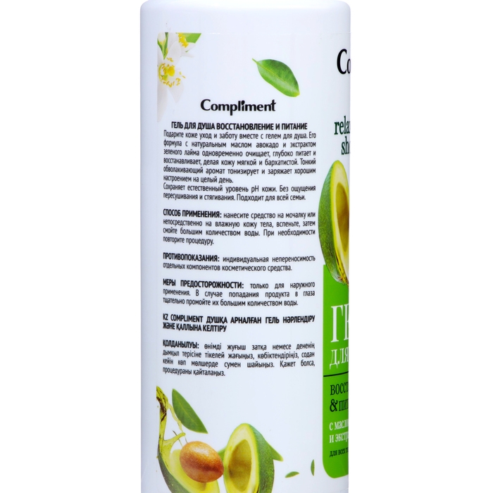 Натуральный гель для душа Compliment — это деликатное средство для очищения кожи, состоящее из натуральных компонентов. Аромат геля для душа разработан с использованием авокадо.