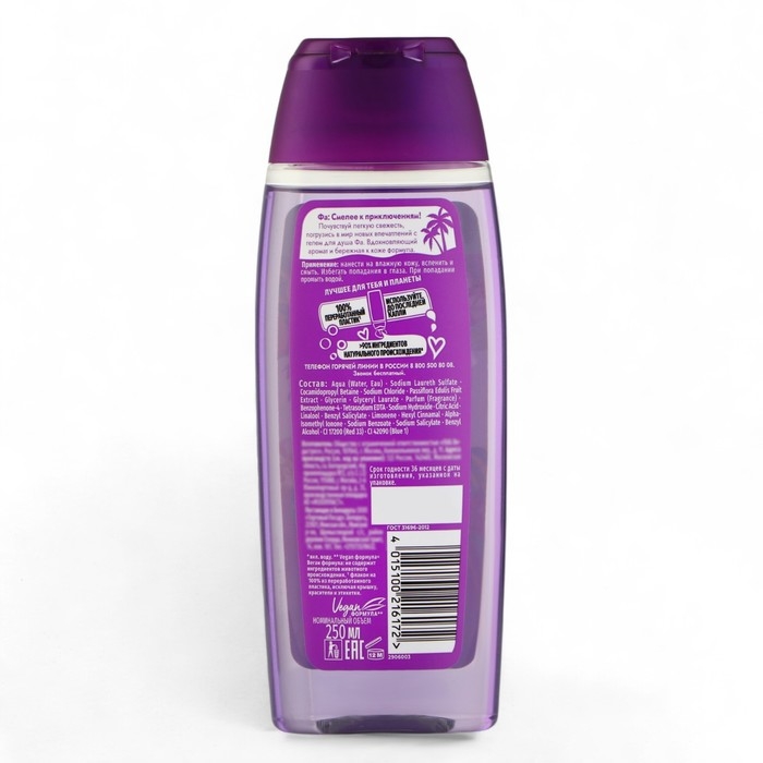 Состав: Aqua (Water, Eau), Sodium Laureth Sulfate, Cocamidopropyl Betaine, Sodium Chloride, Passiflora Edulis Fruit Extract, Glycerin, Guar Hydroxypropyltrimonium Chloride, Parfum (Fragrance), Coco-Glucoside, Caprylyl/Capryl Glucoside, Benzophenone- 4, Trisodium Ethylenediamine Disuccinate, Sodium Hydroxide, Citric Acid, Linalool, Benzyl Salicylate, Limonene, Hexyl Cinnamal, Benzyl Alcohol, Alpha-Isomethyl Ionone, Sodium Benzoate, Sodium Salicylate, CI 17200 (Red 33), CI 42090 (Blue 1)