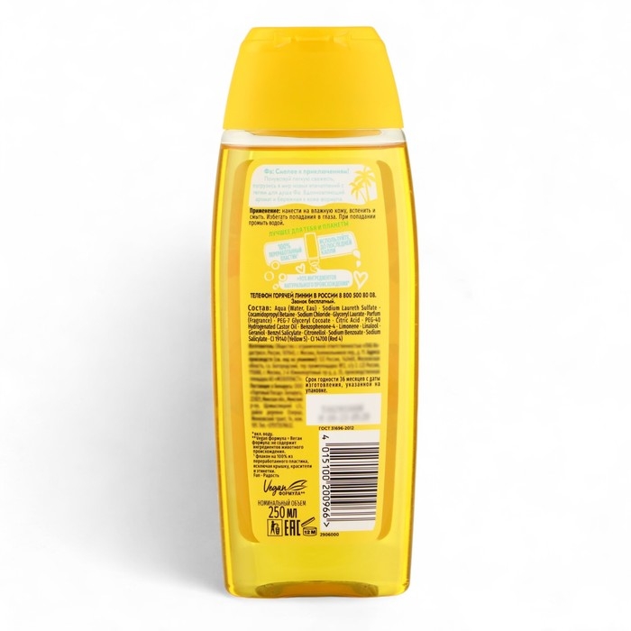 Состав: Aqua, Sodium Laureth Sulfate, Sodium Chloride, Disodium Cocoamphodiacetate, Cocamidopropyl Betaine, Polyquaternium-7, Parfum, PEG-7 Glyceryl Cocoate, Tocopherol, Benzophenone-4, Citric Acid, Limonene, Linalool, Geraniol, Benzyl Salicylate, Citronellol, Sodium Benzoate, Sodium Salicylate, CI 19140, CI 14700.