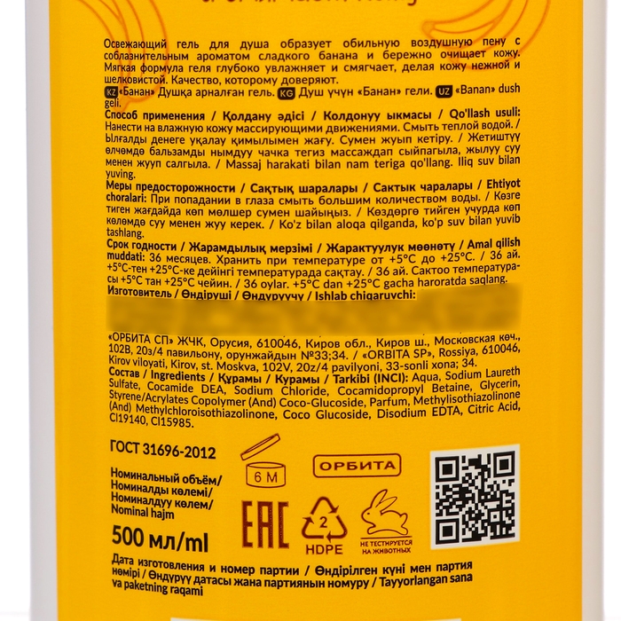 Освежающий, увлажняющий гель для душа с нежным ароматом банана образует обильную воздушную пену и бережно очищает кожу. Мягкая формула геля глубоко увлажняет, делая кожу гладкой и шелковистой. Качество, которому доверяют. Нежный гель для душа с нежным ароматом банана обильно пенится и интенсивно очищает кожу. Мягкие ПАВы в составе средства обладают деликатными моющими и ухаживающими свойствами, не пересушивают кожу, делают её мягкой, шелковистой и гладкой. Экономично расходуется и подходит для ежедневного использования всей семьи.