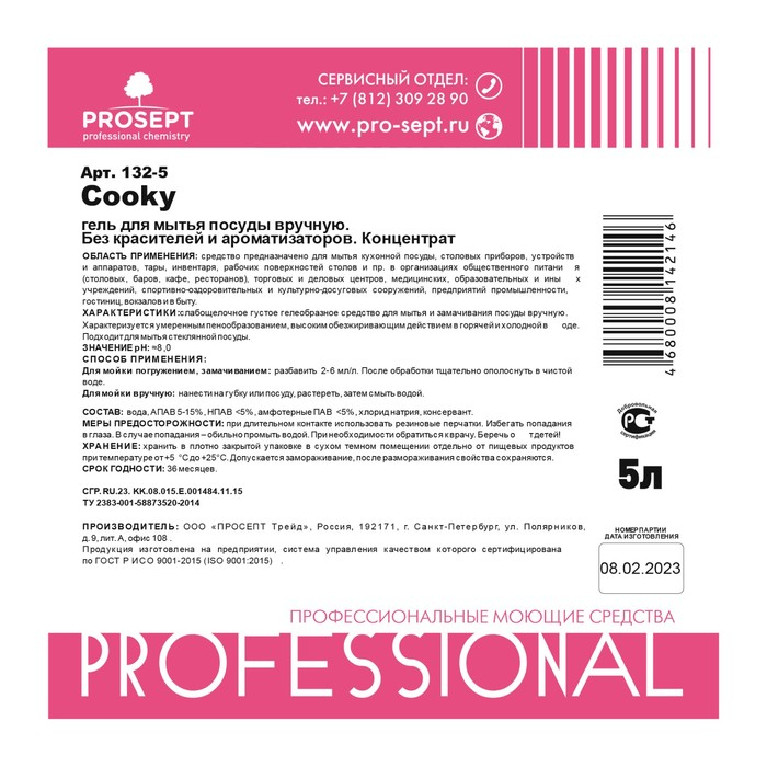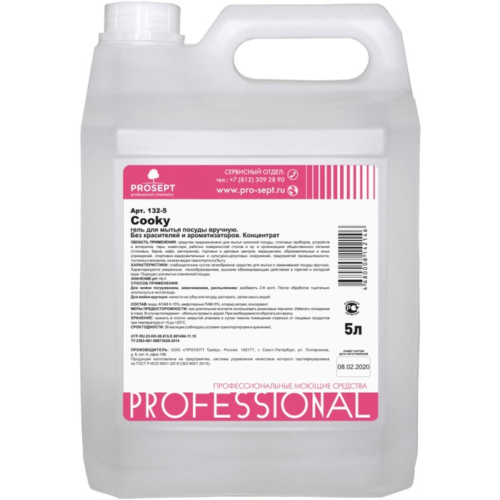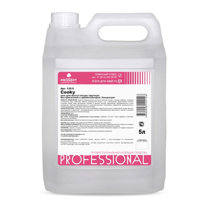 Гель для мытья посуды вручную Cooky. Без запаха. Концентрат, 5л