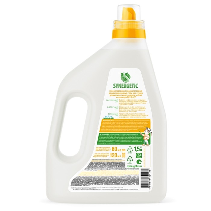 Биоразлагаемый концентрированный гель для стирки деликатных тканей, шерсти, шелка и кашемира SYNERGETIC DELICATE обеспечивает бережное и эффективное очищение тканей, гигиеническую чистоту одежды и устраняет неприятные запахи. Средство можно использовать в стиральных машинах любого типа и при ручной стирке при температуре 20 - 40 °C. Комбинация энзимов и растительных ПАВ эффективно удаляет трудновыводимые и свежие пятна с волокон ткани даже в холодной жесткой воде и при коротких циклах стирки.
