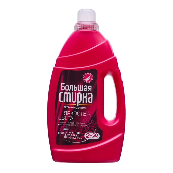 Универсальный гель-концентрат «Большая стирка» - это уникальное средство, которое идеально подходит для эффективной и бережной стирки всех видов цветных тканей. Благодаря инновационной формуле и жидкой текстуре, этот чудо гель обладает не только очищающими свойствами, но и выполняет функцию смягчения, ароматизации и защиты тканей, обеспечивает полностью безупречный результат, не оставляя следов или разводов на вашей одежде.