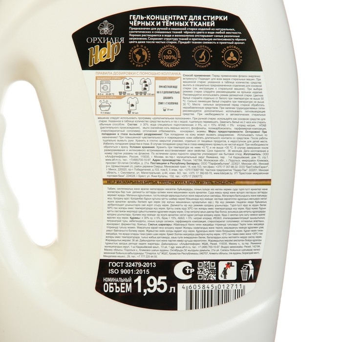 Гель концентрат Help для стирки темных и черных тканей 1,95 л - это эффективное и безопасное средство для стирки темных и черных вещей. Он бережно очищает ткани, сохраняя их насыщенность цвета. Гель безопасен для окружающей среды, не содержит фосфатов, хлора и других вредных химических веществ.