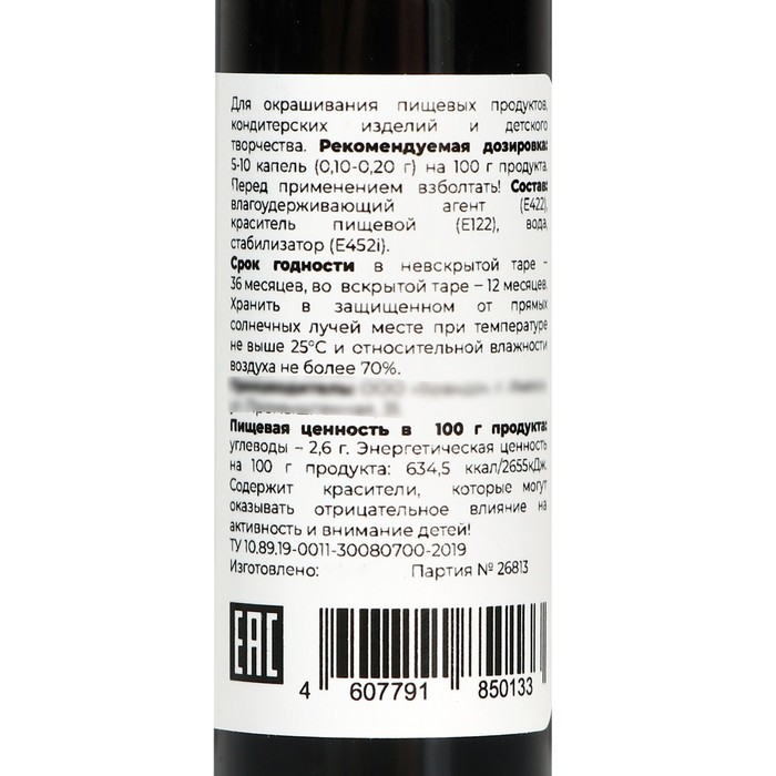 Область применения: для окрашивания продуктов питания и различных кондитерских изделий (теста, мастики, айсинга, марципана, крема и так далее), а также для детского творчества (мыловарение, слаймы).