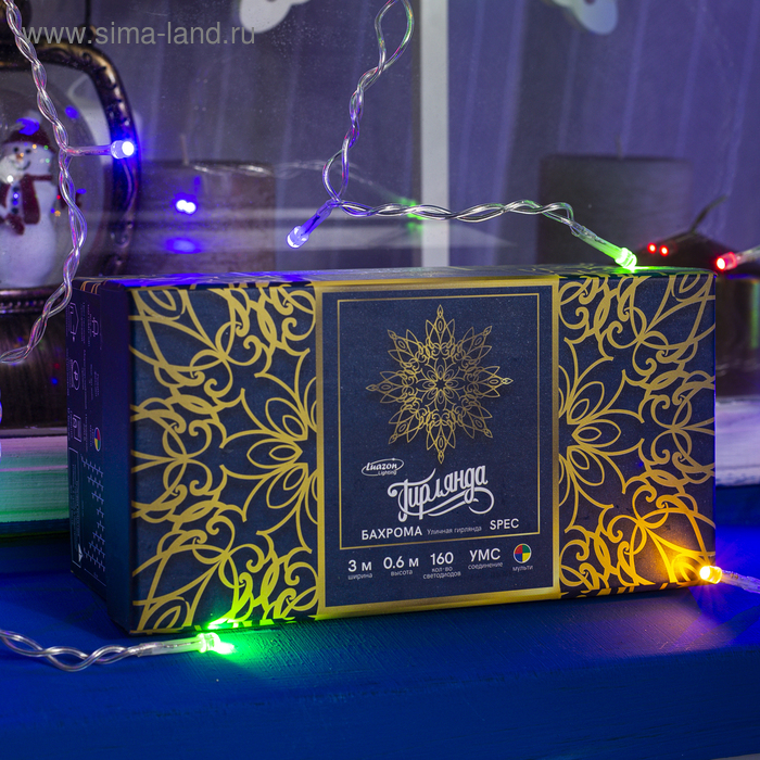 Гирлянда «Бахрома» 3 × 0.6 м, IP44, УМС, прозрачная нить, 160 SMD-LED, свечение мульти, 220 В