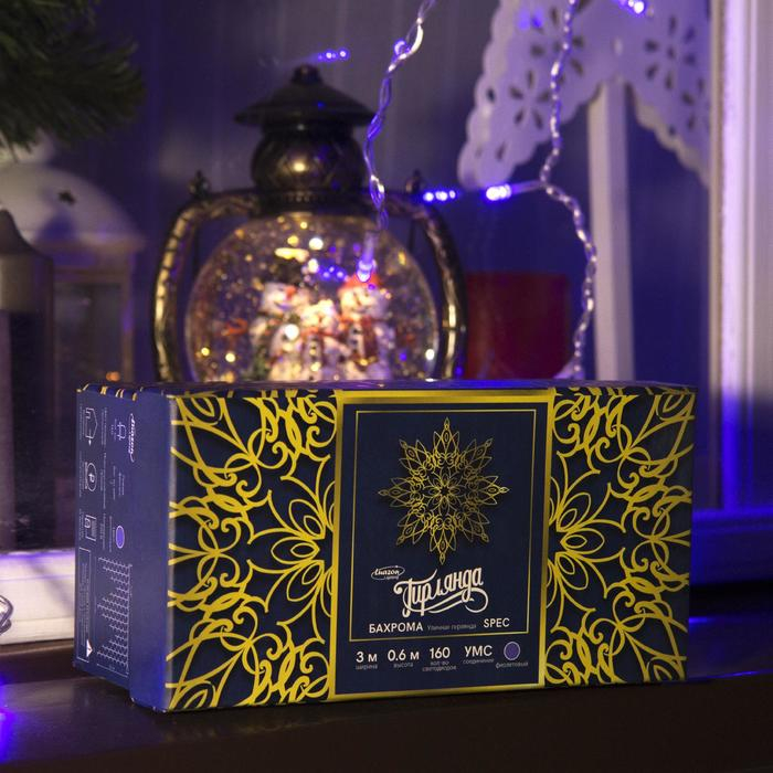 Гирлянда «Бахрома» 3 × 0.6 м, IP44, УМС, прозрачная нить, 160 LED, свечение фиолетовое, 220 В