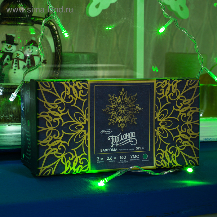 Гирлянда «Бахрома» 3 × 0.6 м, IP44, УМС, прозрачная нить, 160 LED, свечение зелёное, мерцание белым, 220 В