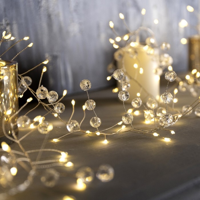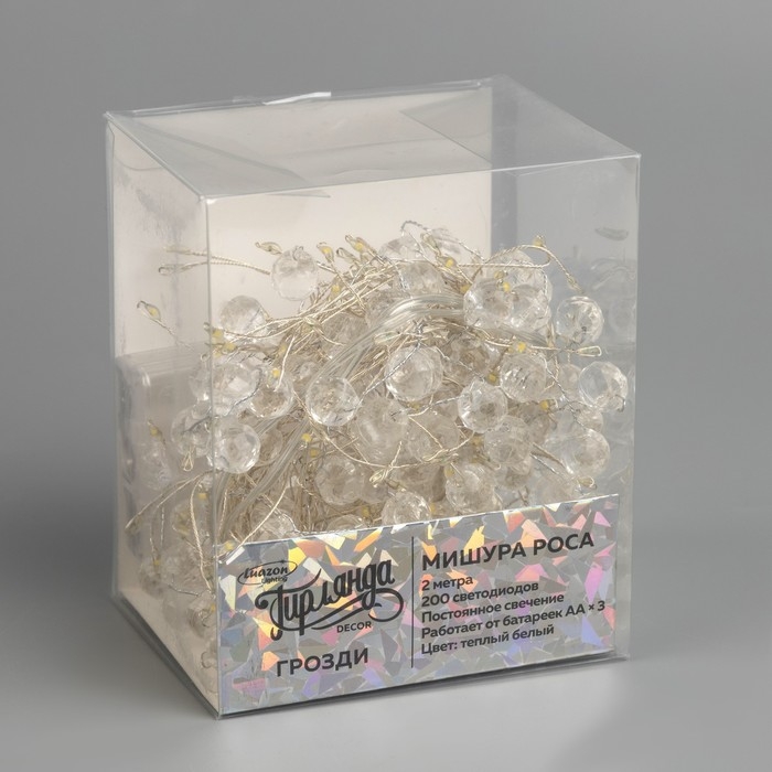 Гирлянда «Мишура» 2 м роса с насадками «Грозди», IP20, серебристая нить, 200 LED, свечение тёплое белое, ААх3