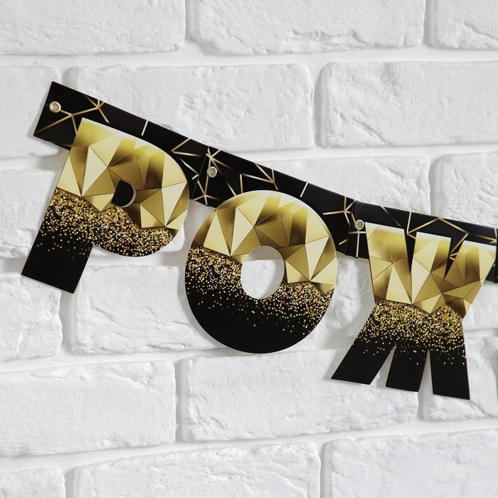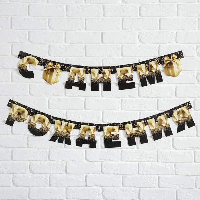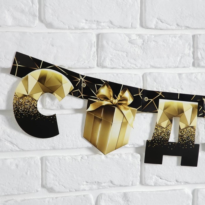 Гирлянда на люверсах «С Днем Рождения», чёрно-золотой с подарком, дл. 225 см., 250 гр/кв.м